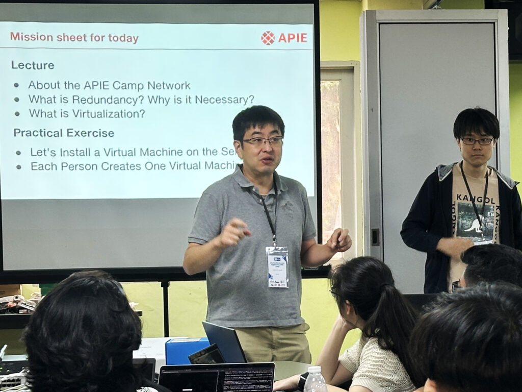 Led by Dr. Kudo (Keio University) and Dr. Shankar Karuppayah (USM), campers explored hypervisor technology, Linux fundamentals, and network security best practices. The NOC team (Bok Wei Hong (USM), Rayhan Egar Sadtya Nugraha (UB), Yuta Ito (Keio), Le Viet Anh (HUST), and Yoshiki Uchida (Keio, remote)) supported participants in deploying virtual machines, configuring routers, and hardening public-facing servers. By the end of the day, students had built their first virtualized network environments and practiced defensive strategies to protect them.