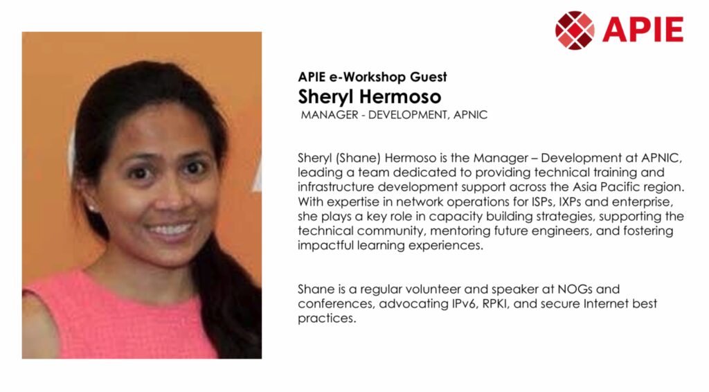 • Sheryl (Shane) Hermoso (APNIC), who explored the structure of the Internet ecosystem and pathways for engineers to participate in the technical community
